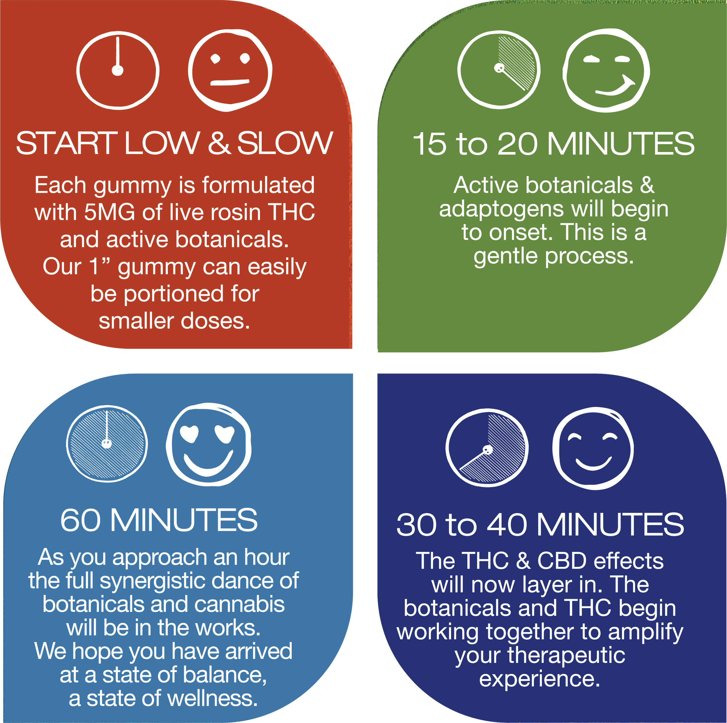 Upon consumption, the active botanicals should be felt within 15-20 minutes. The THC and CBD effects should be felt within 30-40 minutes. Please note the onset could take up to 60 minutes to feel the full effect and could last up to 6 hours.